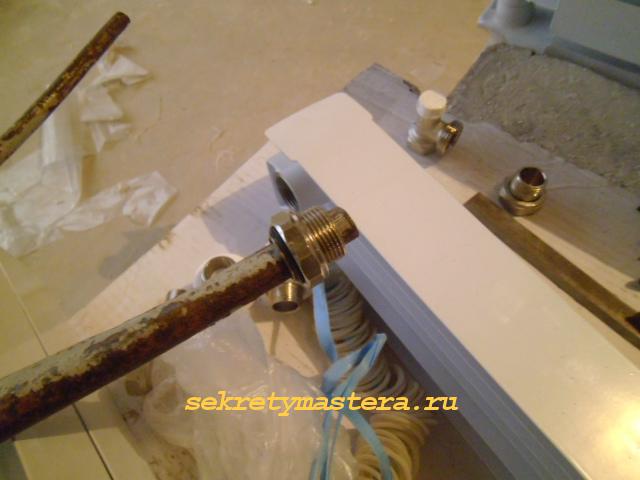 - Развийте фитингите, свързващи батерията към линията. Проверете едновременно състоянието им. Ако забележите някакви недостатъци - пукнатини или „загладени“ нишки - по-добре е да замените тези елементи с нови. Само имайте предвид, че не всички метали се комбинират с алуминиеви радиатори. Например фитингите от месинг или мед не могат да се използват категорично, тъй като това може да доведе до електрохимична реакция, която да доведе до началото на корозивни процеси.