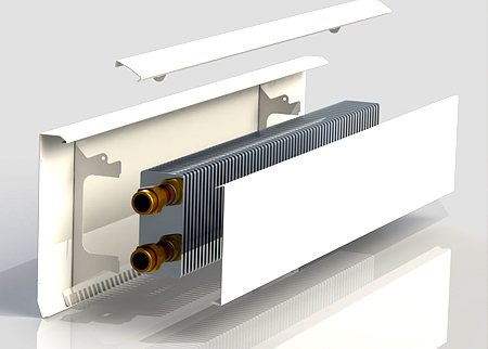 В конструкцията на конвектора са използвани алуминий и мед, които имат отличен топлопренос. По този начин, когато работната температура на первазния конвектор е 40 °, стените се нагряват до 37 °.