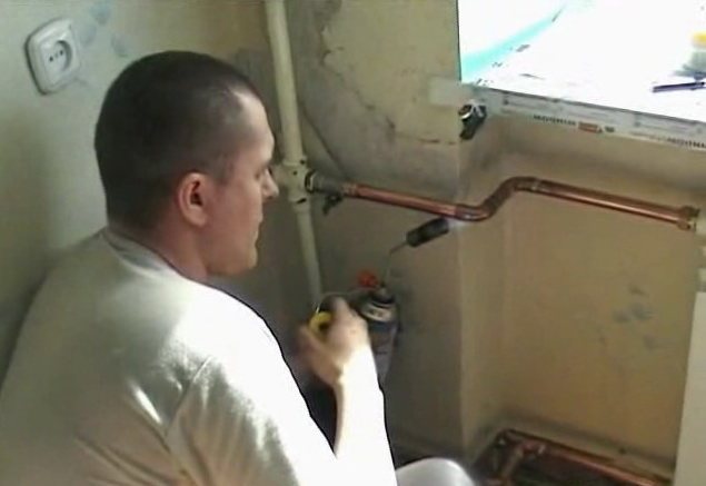 Ако има медни тръби, тогава завийте фитингите само за проба, след това ги развийте обратно. Измерете необходимата дължина на тръбата към въртящия се фитинг. Вземете тръбата и отрежете желаното парче. След това почистваме ръбовете със същата мелница. Поставете го в легнало положение и задвижете края на тръбата във въртящ се кръг. Пригответе горелка. Желателно е с тесен край на пламъка, но те са малко по-скъпи, така че ако няма възможност, тогава можете да се справите с най-простия за 150-200 рубли. Приготвяме спойката. Залепете преходния фитинг (от окабеляването) на тръбата поотделно и след това завийте фитинга с тръбата на място. Ако направите обратното, съществува риск от изгаряне на клапана в сферичния кран.