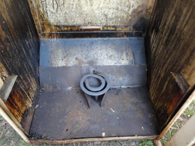 Вторият край на комина е разположен в горната част на ямата, където трябва да организирате място за огнището. За тази цел могат да се използват огнеупорни тухли, метални листове или други подходящи материали, като стара метална пералня. Тук правят огън и чакат да се появят въглените. По това време можете да разпределите храната върху метални решетки или да ги закачите на куки, като се грижите за надеждността на закрепването. Когато огънят изгори, трябва да инсталирате палет с подготвени дървени стърготини и да покриете камината с лист метал или друг подходящ материал, който осигурява плътно прилепване към повърхността. Остава само да затворите вратата на бившия хладилник и да наблюдавате процеса на готвене.