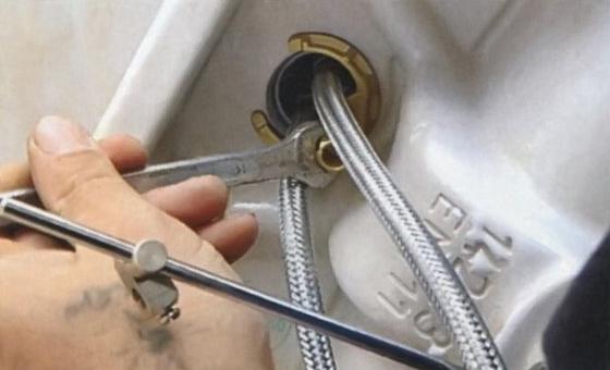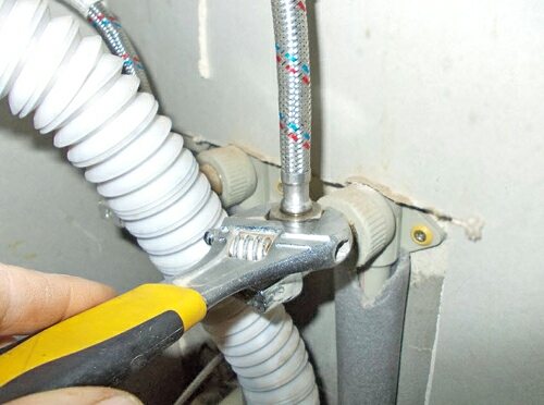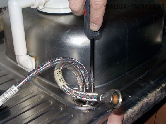 - Ако мивката не е инсталирана, ние я инсталираме... След това навиваме лентата FUM върху съединителите на водопроводите и навиваме краищата на гъвкавите маркучи. Затегнете с регулируем ключ.