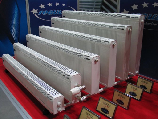 Този тип отоплителни уреди се появиха у нас не толкова отдавна. Това са много подобни устройства на медно-алуминиевите радиатори: същата медна тръба, върху която са поставени медни или алуминиеви конвективни плочи. Те просто имат различен метод на свързване, оформление и други размери.Нагревателните елементи могат да бъдат вкарани в нагревателни модули (тръби с плочи) или да бъдат монтирани в затворени вериги, през които циркулира охлаждащата течност. Те са разположени по пода по периметъра на стените, покрити с метални декоративни наслагвания. На ширина - около 3 см, на височина 12-20 см, в зависимост от мощността. Точно ниски радиатори.