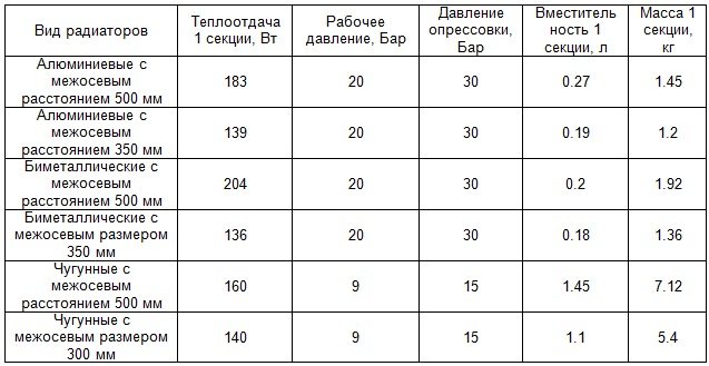 По-долу в таблицата ще представим различни опции за нови нагреватели, включително чугунени евро батерии, където ще посочим показатели, притесняващи собствениците на жилища - теглото на реброто, неговия капацитет, топлопреминаването и цената в конвенционални единици.