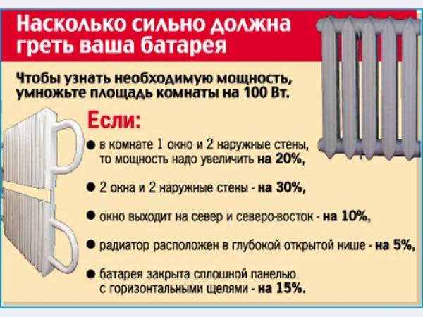 Съответно, ако закупите радиатори с топлопредаване на една секция от 200 W, тогава броят на секциите ще бъде 5 бр. Стаята ще има ли високи тавани до 3,5 м? Тогава броят на секциите ще се увеличи до 6 парчета. Стаята има ли две външни стени (ъглова стая)? В този случай трябва да добавите още един раздел.