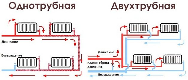 Според вида на системата за топлоснабдяване се разграничават еднотръбна и двутръбна връзка на нагревателни елементи. В многоетажни жилищни сгради се използва главно еднотръбна система за топлоснабдяване. Недостатъкът тук е доста значителна разлика в температурата на входящата и изходящата вода в различни краища на системата, което показва неравномерното разпределение на топлинната енергия между акумулаторните устройства.