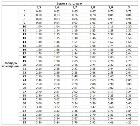 K5 - зависи от височината на помещението от пода до тавана. Стандартната височина е h = 2,7 m с индикатор, равен на единица. Ако височината на помещението се различава от стандартната, се въвежда корекционен коефициент: