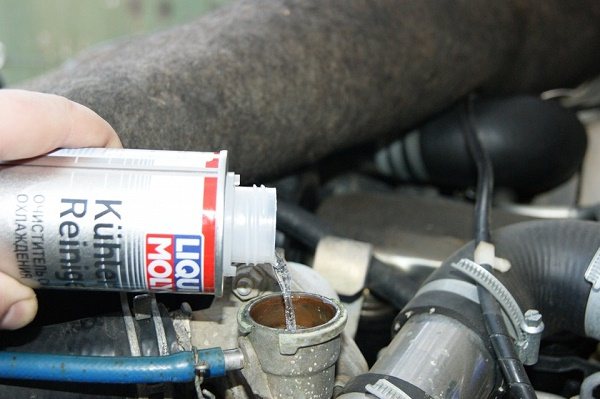 Наложително е да добавите почистващ препарат за радиатора към дестилираната течност, излята в охладителната система. Ефективността на измиване се увеличава няколко пъти. Дозировката на химикала ще бъде посочена в инструкциите. Трябва да се спазва, за да се предотврати повреда на охладителната система.