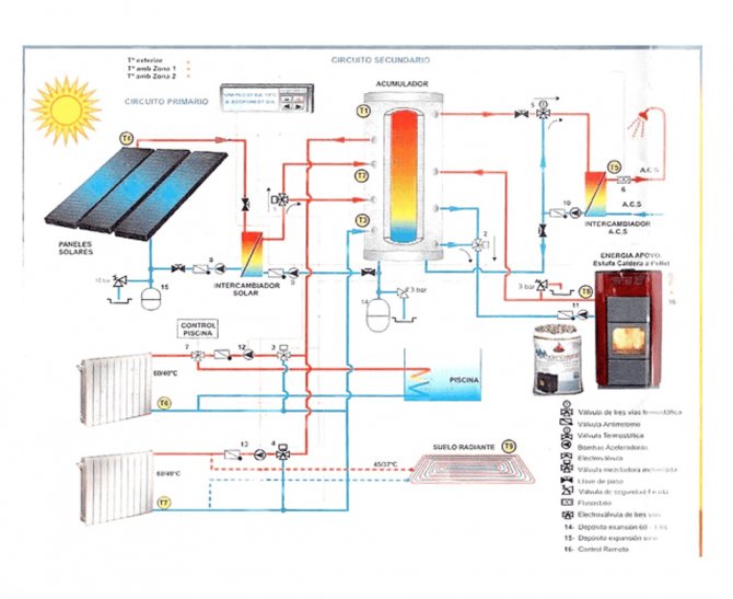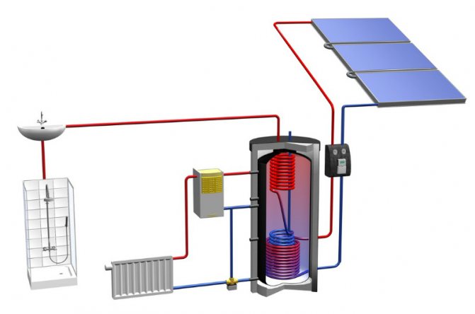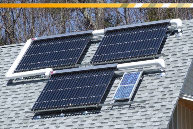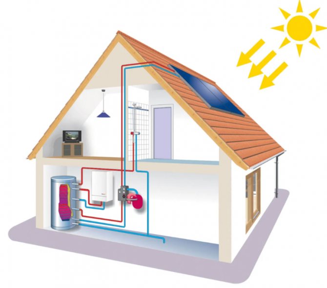 Недалеч от къщата инсталирахме два вакуумни колектора с 24 тръби. Не е достатъчно за отопление, но е достатъчно за топла вода. Водата е просто вряща вода. Инсталаторите помогнаха да го свържат към отоплителната система за нагряване на вода и след това до необходимите 70 градуса с газов котел.