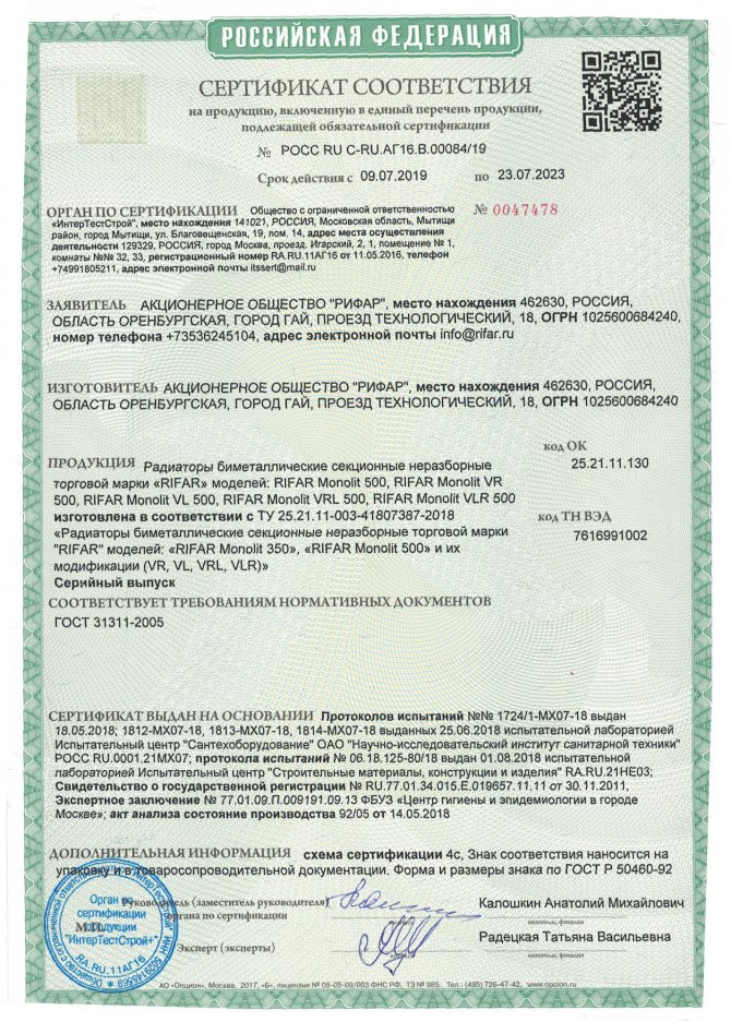 И двете серии секционни радиатори Rifar работят с един и същ тип топлоносител, което има право да използва техническа вода, посочена в съответствие с параметрите на GOST. Гаранцията на производителя е 10 години, докато спазването на условията на работа увеличава гаранционния период на непрекъснатото обслужване на устройството до 25 години.