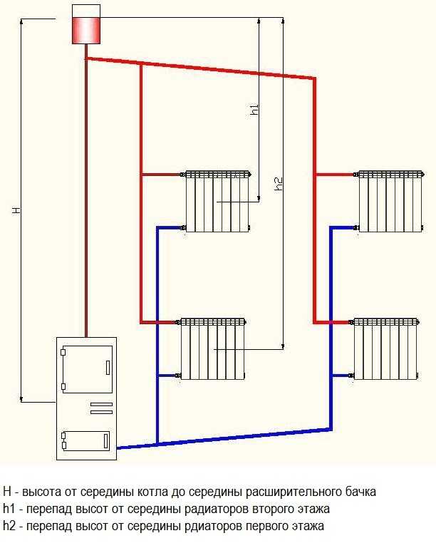 Топлата вода (червена на диаграмата) се издига през един щранг и преминава, например, през спалните, до горния етаж, където в цикъл се спуска през други стаи (синьо). Тази схема е проектирана от съветско време за използване на чугунени радиатори. Топлата вода навлиза в долния колектор на радиатора и след като е преминала през всички секции, оставя батерията през горния колектор.