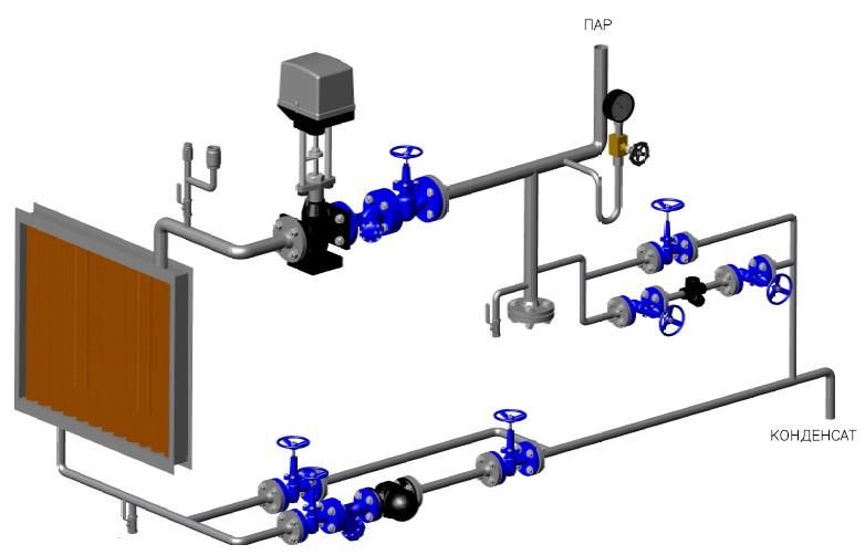 Работата на нагревателите, работещи на топлоносител като пара, се контролира посредством специални клапани, монтирани на входящата тръба.