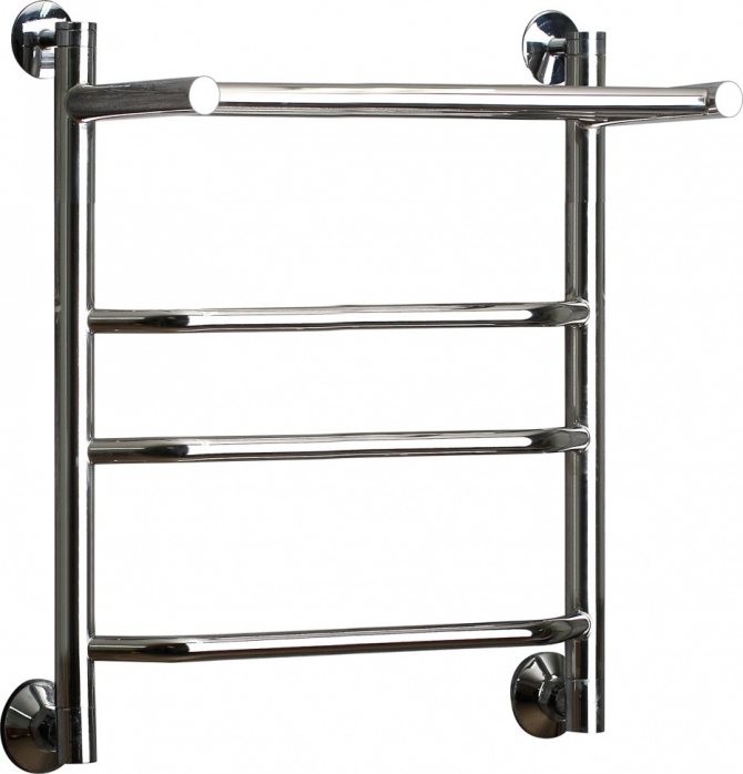 За тесни бани е препоръчително да закупите модел модел за затопляне на кърпи с вграден рафт, върху която можете да поставите козметични и хигиенни артикули.