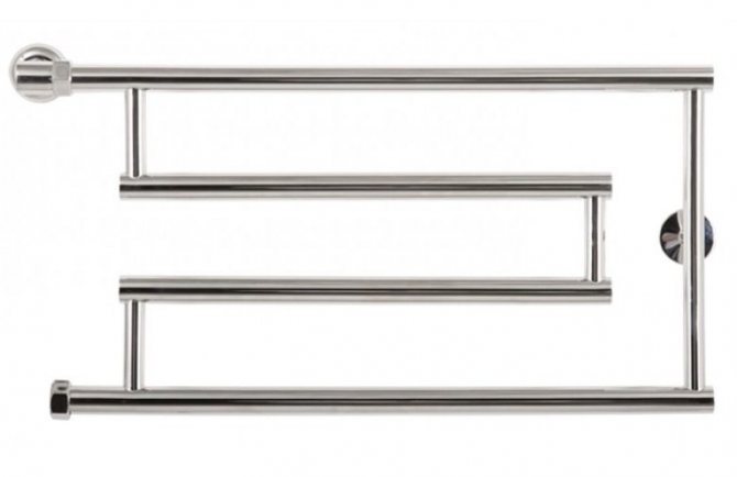 - Ако банята е малка, тогава трябва да се спрете на нагревател за кърпи с плъзгащи се "уши". Нека обясним, че нагревателят за кърпи има фиксирана централна секция. От него в страни може да се раздалечат "уши" - една или две други секции на устройството. Дизайнът работи на принципа на вратите на шкафа. Ако трябва да закачите много мокро пране, за да изсъхне, тогава отделяме допълнителните части на устройството, ако не е необходимо, тогава се справяме с централната част.
