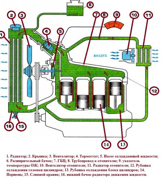 Охлаждането на двигателя работи по следния принцип. Стартираният двигател с вътрешно горене върти работното колело на водната помпа. Благодарение на това антифризът започва да циркулира в системата (в тесен кръг). Когато температурата на течността достигне 80-90 градуса, термостатът се задейства и се отваря голям кръг на циркулация. Това позволява на двигателя да се загрее по-бързо до желаната температура.