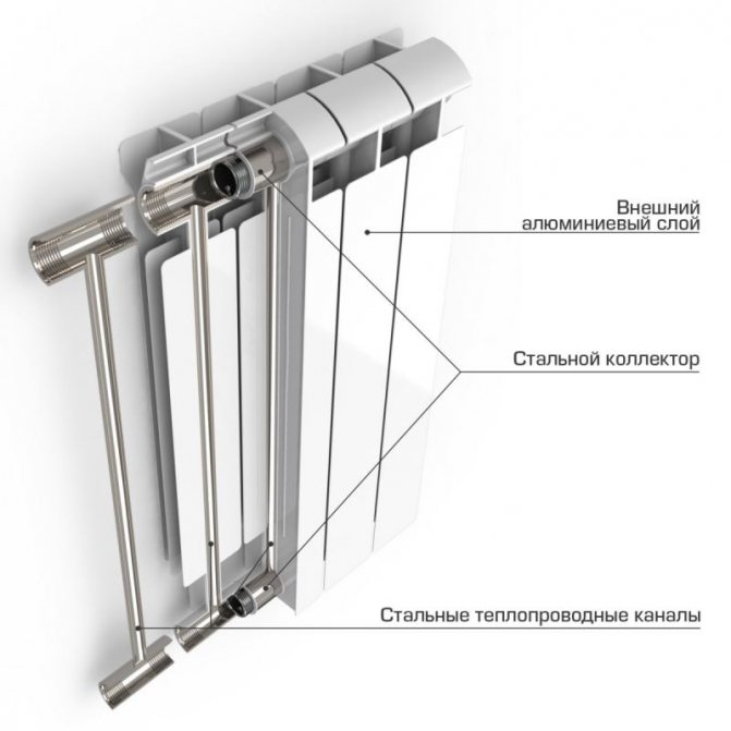 Секционният алуминиев нагревател се състои от 3-4 отделни секции. Като правило към алуминия се добавят титан, силиций, цинк. Тези метали правят продукта по-траен и устойчив на разкъсване и корозия. Всички секции са свързани помежду си с помощта на конектор с резба. За уплътняване на връзката се използват силиконови уплътнения. Вътрешността на радиаторите е с полимерно покритие, за да се предотврати възможността за разрушаване на батерията.
