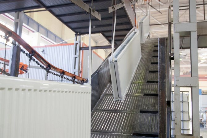 | Висящи радиатори на конвейерна линия | Преместване на радиатори към устройството за подготовка на повърхността | Грундиране на радиатора | Прахово покритие |