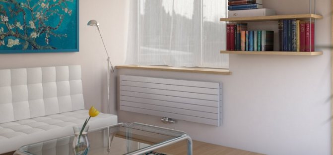 Тези продукти са подходящи за къщи с голям панорамен прозорец и нисък перваз на прозореца. Често се избират подови батерии, ако носещата стена просто не може да издържи натоварването на традиционния модел.