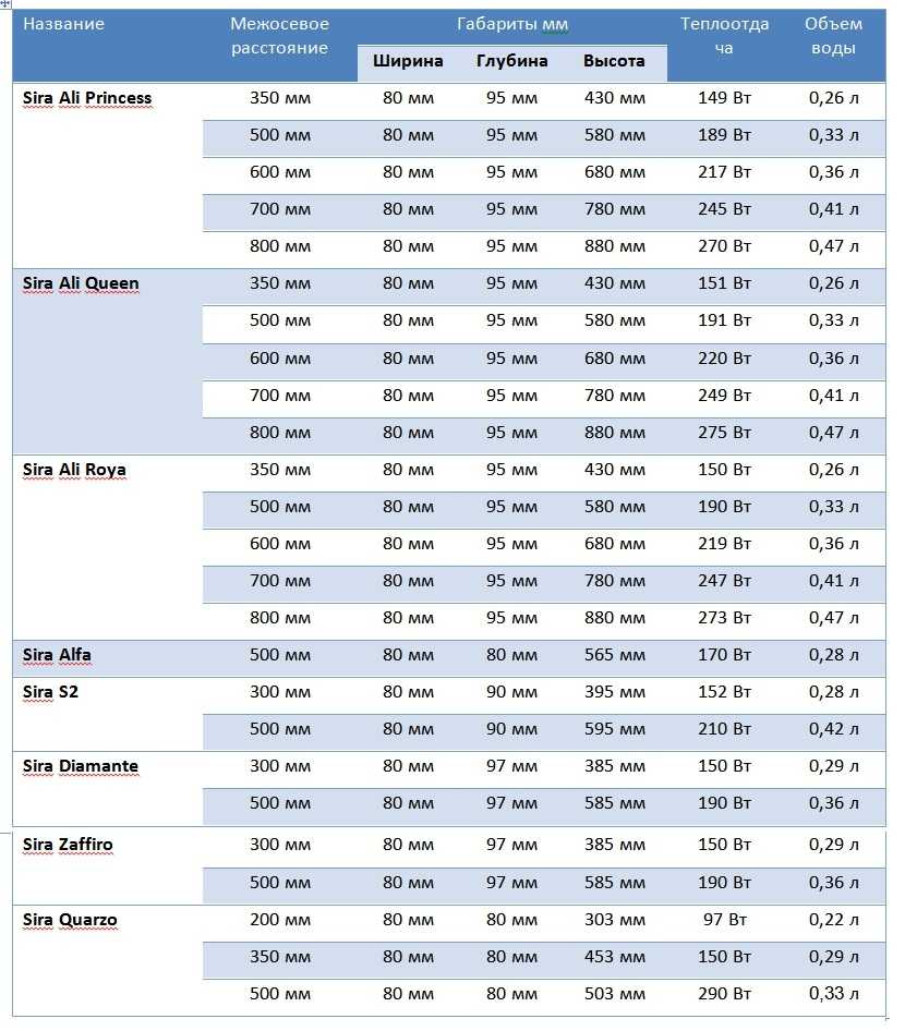 Sira R.S. батерийни секции Биметалите имат следните размери: височина - 372 мм, дълбочина - 95 мм, ширина - 80 мм. Компактността на радиаторите позволява да се инсталират в помещения с малка площ. Сглобяването на секциите се извършва само в четен брой. При желание дистрибуторът ще може да изпълни индивидуална поръчка. Максималният брой секции не трябва да надвишава 20 броя.