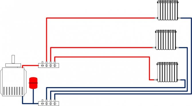Тази система се различава от останалите по това, че към всяко отоплително устройство се полага отделна двойка тръби - както напред, така и обратен поток. След това те се сближават близо до котела на специални гребени. Общата дължина на тръбите е по-голяма, отколкото при двутръбна система.