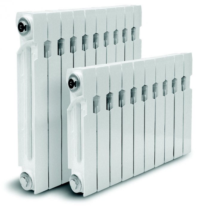 Чугунени батерии - отоплителна конструкция, състояща се от секции от сив чугун чрез леене... В зависимост от обема на стаята, броят на секциите може да бъде различен: от 2 до 20-30 или повече и тяхната височина от 35 см до 1,5 метра... Секцията е куха отвътре и има един или два канала. По време на монтажа батериите се поставят на крака или се окачват на надеждни скоби към стената, тъй като имат голямо тегло - една секция от 5 до 7 кг... Те имат дълъг експлоатационен живот - 50 години и повече... Те се използват за централно отопление, където водата може да съдържа агресивни алкални съединения, твърди примеси (пясък, камъчета), като по този начин тази охлаждаща течност с високо налягане влияе отрицателно върху структурата на материала на батерията, разрушавайки я отвътре.