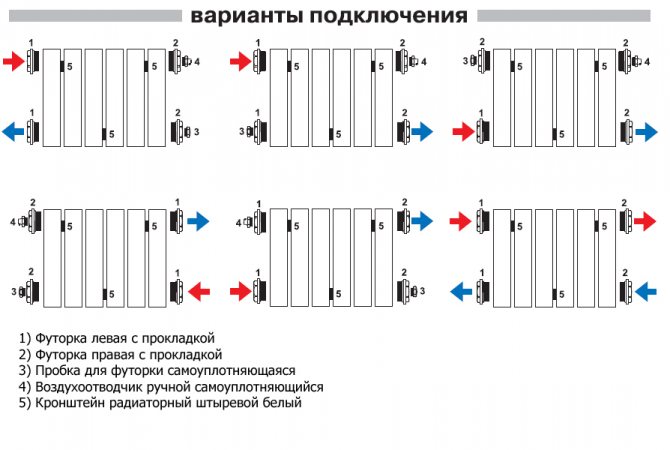 Горните дъги, които прикрепят секциите към опората, също се различават. Те са направени от стоманена тел или имат формата на верига от подвижни съединени връзки. Във всеки случай радиаторите са фиксирани към ограничителя с болтове и дъги.