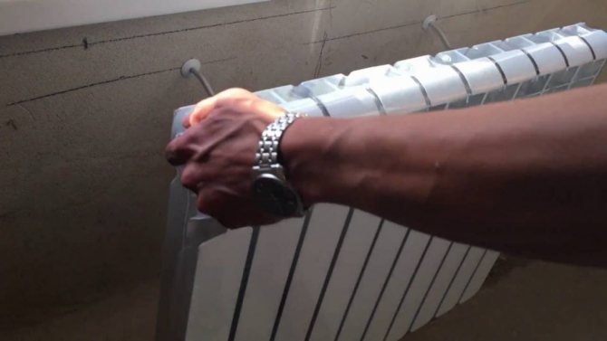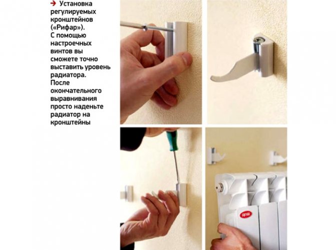 - Тъй като теглото на радиатора е малко, ще бъде достатъчно да го фиксирате върху скобите отгоре. Можете да поставите опори отдолу, те ще му дадат хоризонтална посока. Те се придържат към скобите с куки и допират само до стената.