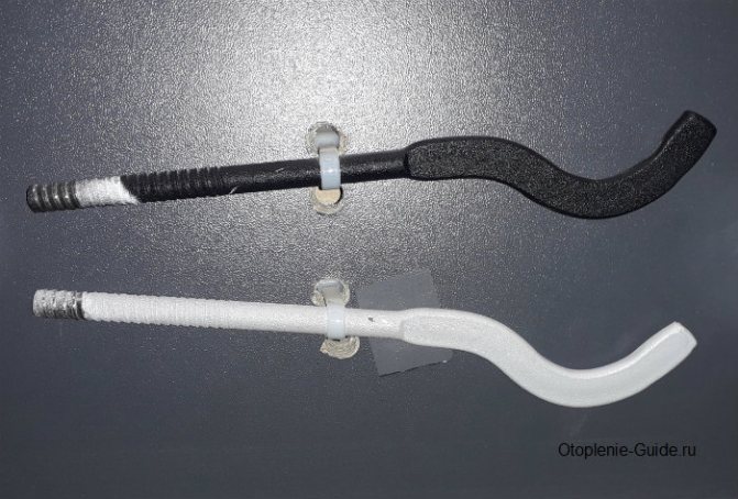 Монтажите за чугунени отоплителни радиатори са най-дебелите и тежки, тъй като трябва да държи голяма тежест в продължение на години. Тези извити щифтове или плоски куки се произвеждат отделно или са прикрепени към стоманена пръчка на 2-3 парчета.