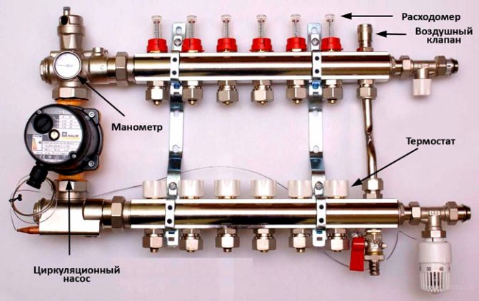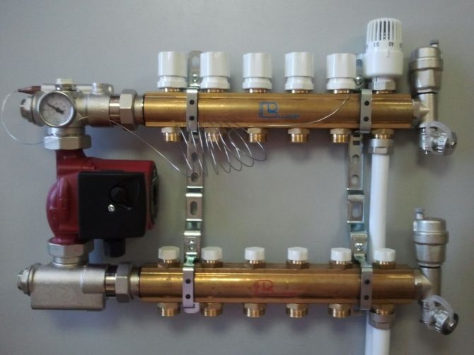 В продажба има готови колекторни смесителни блокове, в които са монтирани циркулационна електрическа помпа, балансиращи клапани за всеки клон, водомери, термостат, изходи за въздух, някои модели са оборудвани с устройства за контрол на налягането. Много модификации нямат вграден байпас, който обикновено не се инсталира в двутръбни системи и се счита за ненужна част в тях.Но някои модели имат този елемент, друга роля на който е да компенсира излишното налягане в тръбопровода за подово отопление, когато се издигне, част от потока навлиза в обратната линия, ако колекторът му е разположен под директния. В същото време елементът намалява последиците от хидравлични удари, които възникват при включване и изключване на кръговата електрическа помпа в линията за подово отопление.
