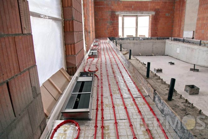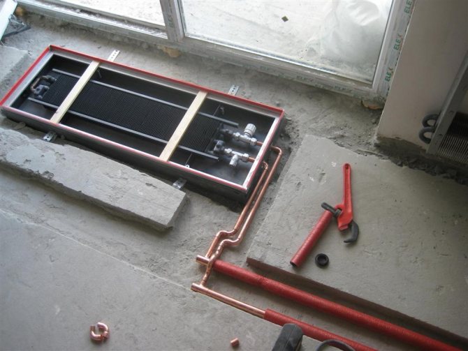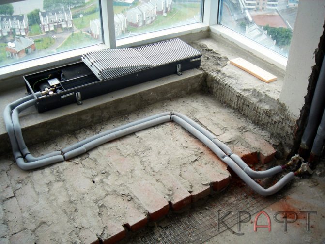 Препоръчително е да се осигури място за монтиране на конвектор, вграден в пода на етапа на строителството на сградата. В този случай организирането на ниша за инсталиране на отоплително устройство няма да създаде проблеми.
