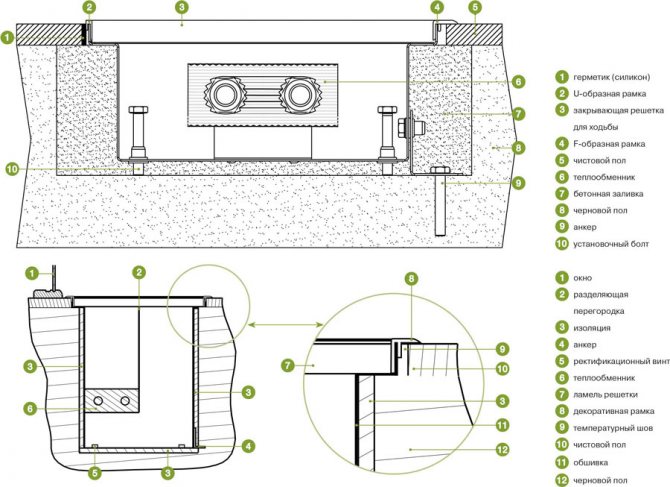 Дълбочината трябва да бъде такава, че декоративната решетка да е изравнена с пода. Тук разстоянието за кацане е 10-15 милиметра. Следователно подготовката на нишата започва след избора на подов конвектор.