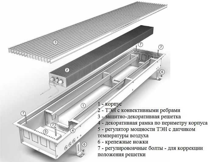 В конвектори с принудителна циркулация въздухът се движи поради работата на вградения тангенциален вентилатор. Прилича на колело с извити остриета. Тихо е, но все още има някакъв шум. Подови конвектори с вентилатор са свързани към електрическата мрежа, в тях е монтиран контролен блок с термостат.