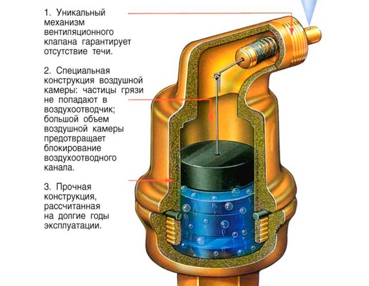 Изработен е от метален цилиндър, в който се помещава поплавък, който е свързан с иглена клапа в горната част на клапана. Когато въздухът се натрупва в кухината на цилиндъра, нивото на топлоносителя намалява, поплавъкът се спуска и отваря отвора на игления клапан, през който въздухът излиза.