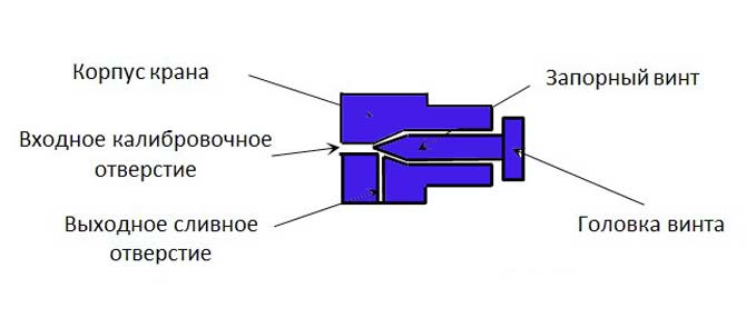 Дизайнът на крана е доста прост. Състои се от тяло с калибриран тънък отвор и заключен винт с конусна глава. Корпусът има отвор за изход на въздуха навън.