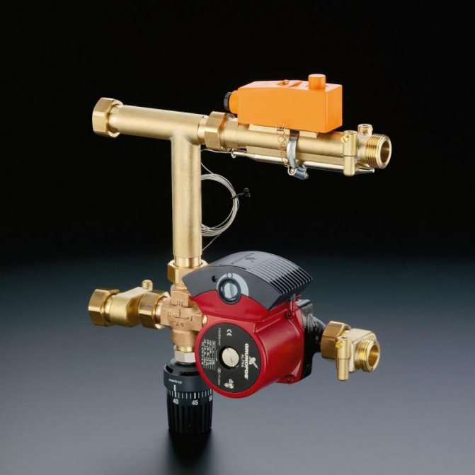 За изпълнение на схемата на свързване на смесителния блок за отопление с двупосочен клапан и последователна връзка, директният поток на отоплителната система се променя от обратния и циркулационната помпа се поставя на байпаса.