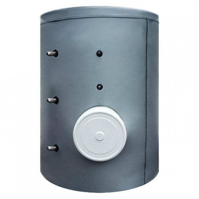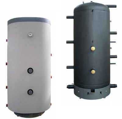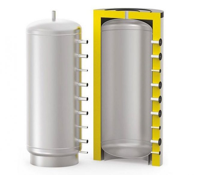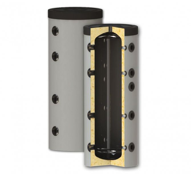 Isı akümülatörü, kural olarak, bazen ek olarak termal olarak yalıtılmış, dikey silindirik bir tanktır. Kazan ve ısıtma cihazları arasında aracıdır. Standart modellerde 2 çift nozul bağlantısı bulunur: ilk çift - kazan beslemesi ve dönüşü (küçük devre); ikinci çift, evin etrafında boşanmış ısıtma devresinin arzı ve dönüşüdür. Küçük devre ve ısıtma devresi üst üste gelmez.