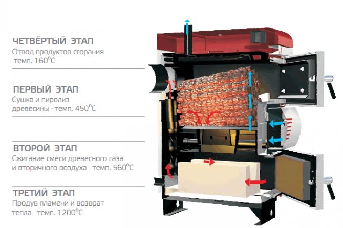 - Yanma odası, yakıtın yanma işleminin belirli bir yerde gerçekleşeceği ve tek yükte kazanın çalışma süresinin artmasına katkıda bulunacak şekilde tasarlanmıştır. Şamot yardımıyla egzoz gazlarını yakabilirsiniz, bu nedenle ısıtma ünitesi kömürle çalışan bir piroliz kazanı haline gelir.