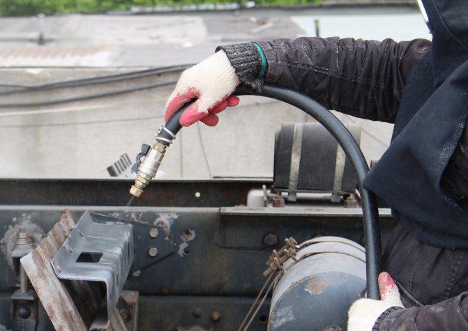 - İkinci boruyu hortumun ikinci ucuna bağlarız. Harcanan reaktif bunun aracılığıyla boşaltılır. Böylece sistem kapatılır ve reaktif borularda dolaşır.