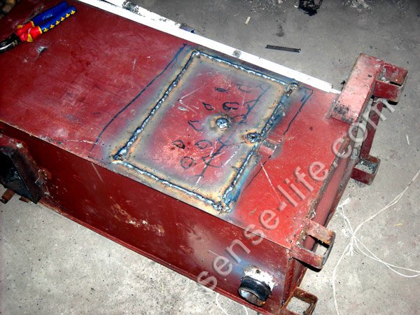 Tüm borular kaynaklandığında, su ceketi sızdırmaz hale getirmeye başlayabilirsiniz, bunun için merkezdeki bağlantı parçalarından, gelecekte kazanın yeniden çalışma sahasında şişmesini önleyecek bir pimi kaynaklıyoruz.