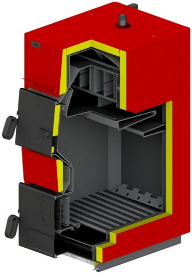 - Ateş kutusu odası. Dökme demir veya çelikten yapılmıştır. Kazan bir veya iki (daha uygun) yanma odası ile olabilir. Çift versiyonda, üst kısımda yakacak odun yakılır ve alt kısımda bir gaz brülörü bulunur.