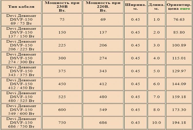 Tek çekirdekli ısıtma Devimat DSVF. Maksimum sıcaklığı 90 ° C'dir. Doğrudan fayans yapıştırıcısına sığar. Bu tür paspasların göstergeleri aşağıdaki gibidir.