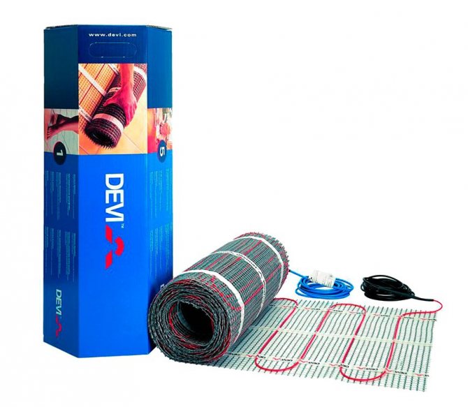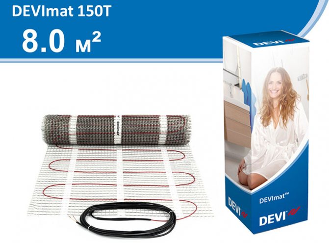 Bölgeye bağlı olarak, en uygun model seçilir - istenen döşeme adımıyla kabloların döşenmesi veya hazır paspasların kurulması. İkinci şema, odanın genişliği paspasların boyutlarının bir katı ise uygun olacaktır. Yerden ısıtma Devimat, Teflon kaplı bir polimer ağdır.