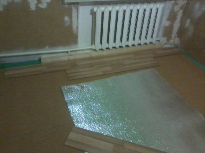 Bazı üreticiler, her iki tarafta da köpük kauçuğun olduğu varyasyonlara sahiptir. Bu yüzden, bir ahşap zemin döşeme sürecini daha ayrıntılı olarak anlatacağız. Bunu yapmak için şunlara ihtiyacımız var: inşaat bıçağı, yalıtım, alüminyum bant, metre, öğütücü, antiseptik astar, macun.