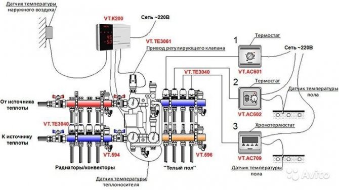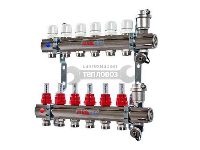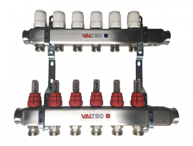 Valtec dağıtım bloğu monte edildi.Sıcak boruya halihazırda takılı akış ölçerler vardır. Soğuk hat üzerinde termal kafalar vardır, ancak ürün yalnızca sıcaklık kontrol cihazlarını takmak için çıkışlara sahip olabilir. Plastik kapaklarla korunurlar. Üretici, hangi otomasyonun kurulacağını seçmeyi mümkün kılar: bir termal kafa, bir servo sürücü.