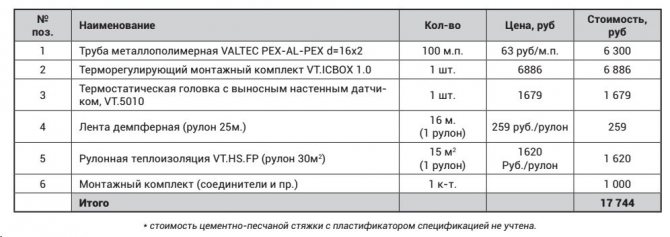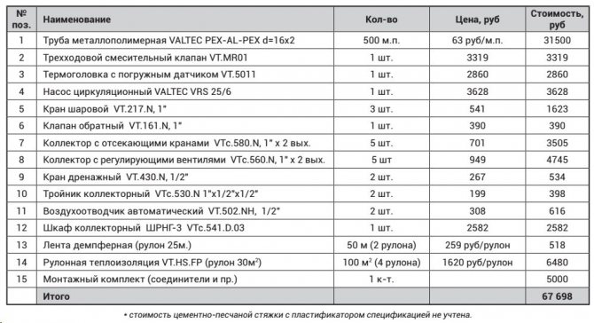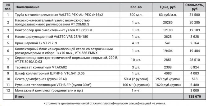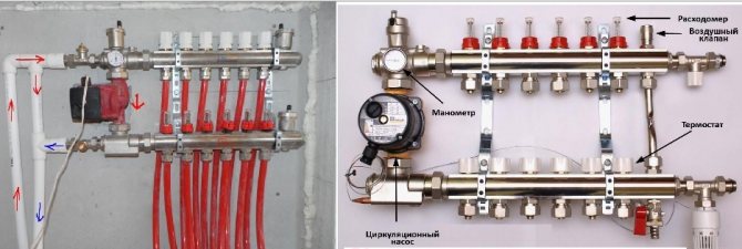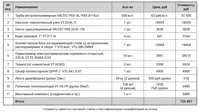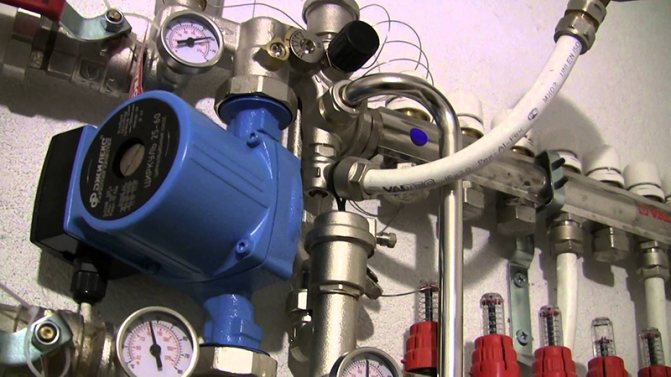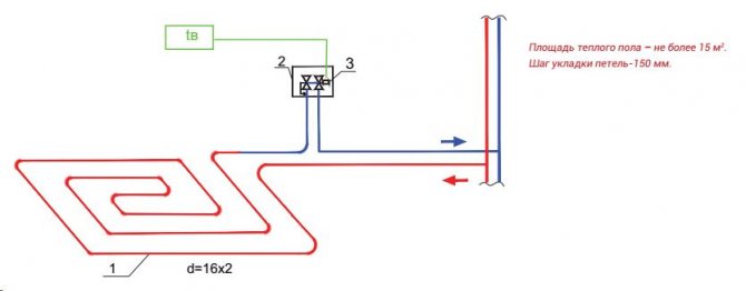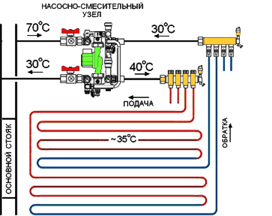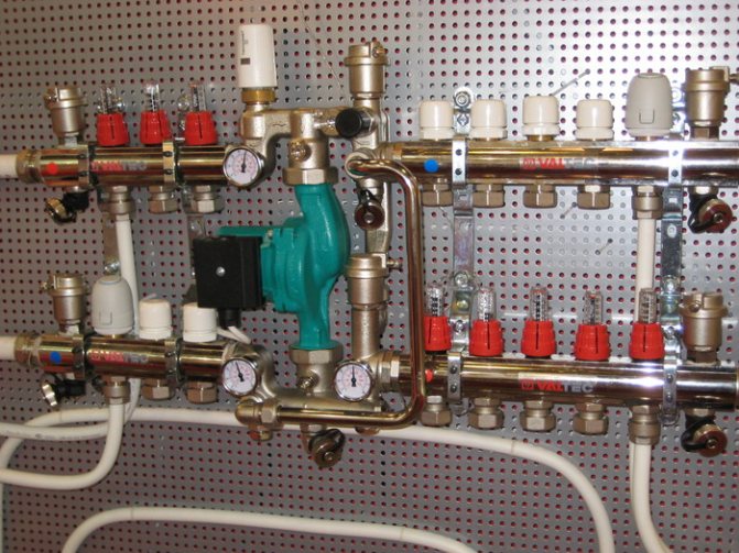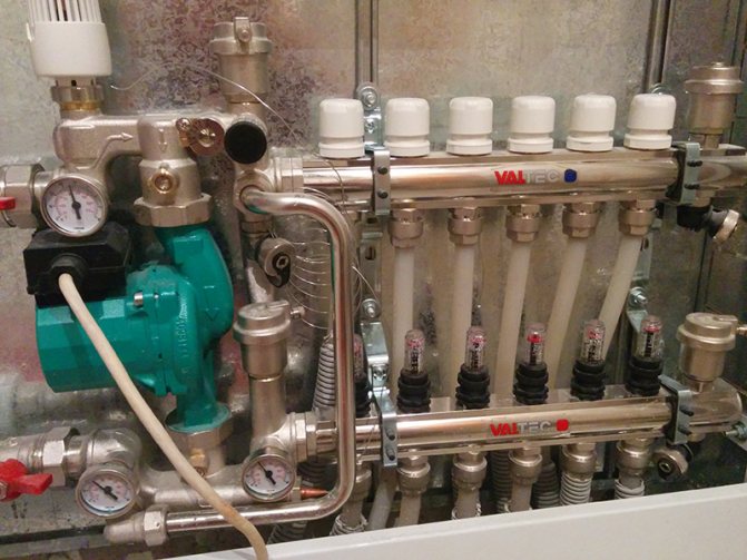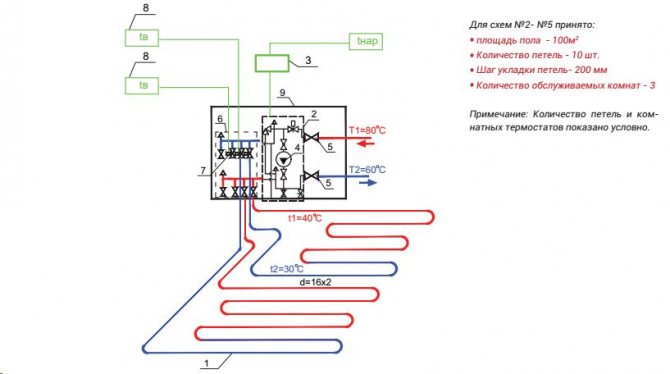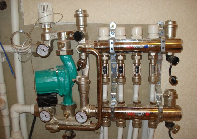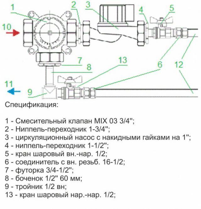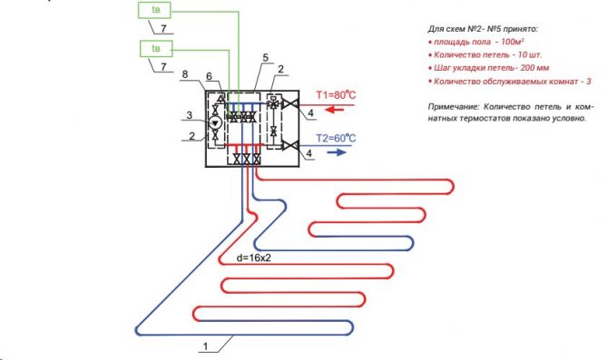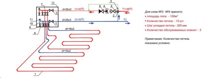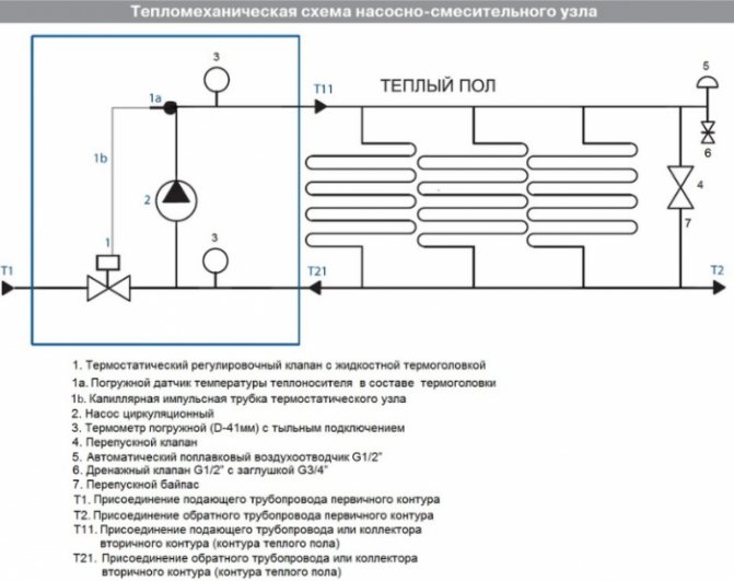 Pompa-karıştırma ünitesinin termal-mekanik diyagramı - Büyük çaplı borularla, içlerinden daha büyük miktarda soğutma sıvısı geçmesine rağmen, şapın kalınlığı, zeminde aşırı yük oluşturmamak için çok büyük olması tavsiye edilmeyen bu gösterge için bir sınırlayıcı görevi görür. Bu nedenle, 16 ila 20 mm çapında bir anti-difüzyon kaplamalı modern çapraz bağlı polietilenden yapılmış Valtec borular dikkate alınır ve bağlantı parçaları olarak Valtec pres bağlantı parçaları kullanılır.