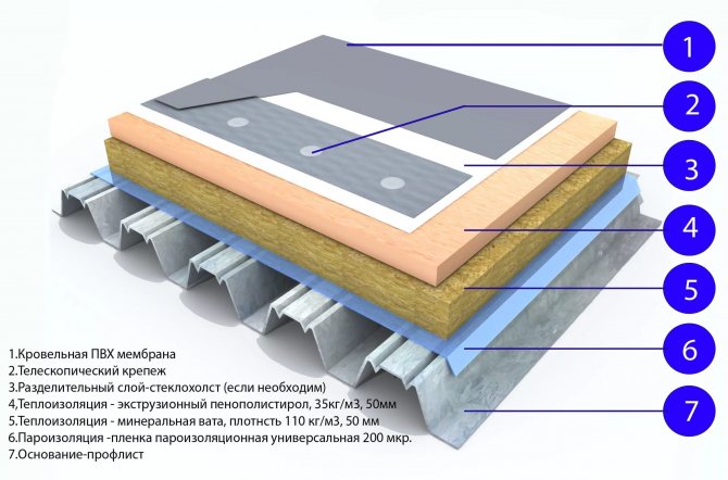 Aşağıdaki diyagramlar, betonarme ve metal profiller üzerine düz bir çatının katman katman montajı için seçenekleri ve bunların tasarım yöntemlerini göstermektedir.