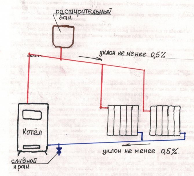 Bununla birlikte, yerçekimi ile ısıtma, besleme ve dönüş borularının doğru eğimlerine sahipse, o zaman herhangi bir vana gerekmez. Eğimli boru hattındaki hava, sistemin en üst noktasına serbestçe yükselecek ve orada, bildiğiniz gibi, açık bir genleşme tankı var. Ayrıca gereksiz unsurları azaltarak açık ısıtma avantajını da ekler.