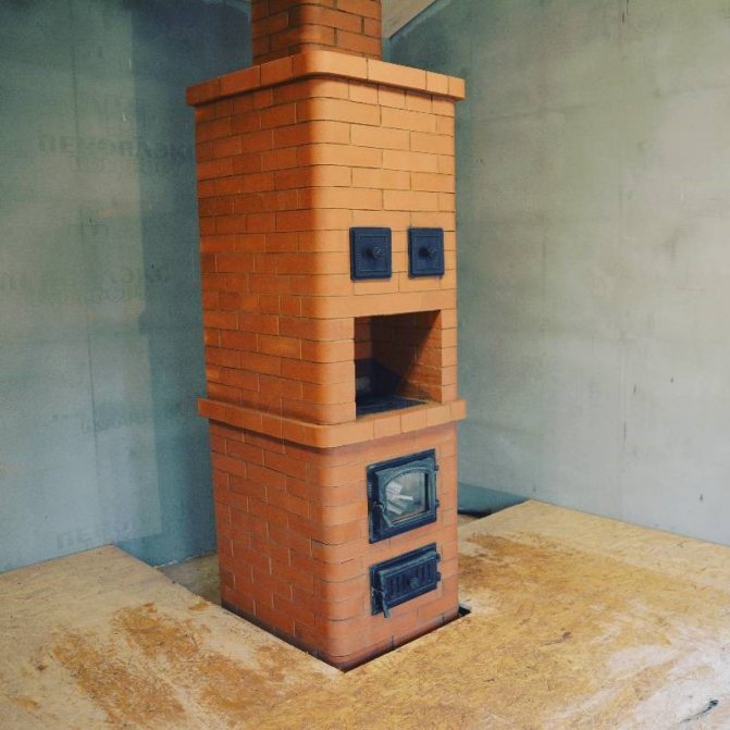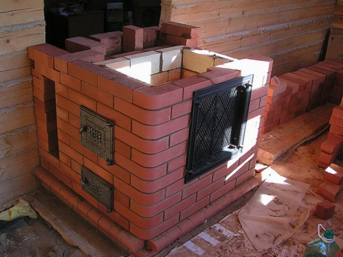 - Bir sıra tuğlaya ince bir kil tabakası uygulanır ve çevresine üç sıra yerleştirilir. Aynı zamanda kapı takılır. Her şey hızlı ve doğru bir şekilde yapılır.