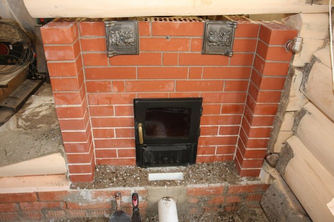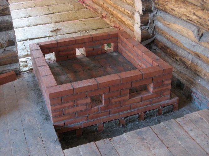 Çalışmaya başlamadan önce sağlam ve eşit bir taban hazırlayın. Bunu yapmak için küçük bir beton podyum doldurabilirsiniz. Dökme demir ateş kutusunun astarı yarım tuğladan yapılmıştır ve duvarlar ile giydirme arasında 1 ila 10 cm kalınlığında bir hava yastığı bırakılır.Ayrıca alt kısmında küçük havalandırma delikleri sağlamak gerekir. bina - ısıtılmış havanın çıkışını sağlayacak ve ısı transferini iyileştirecekler.
