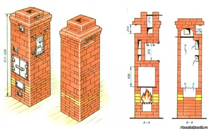 2008 yılı "Dom" 10 numaralı dergide yayınlandı. Makalenin yazarı St. Petersburg'dan A. Sushkov. Sobanın alt kısmı iyi bir ısınmaya sahiptir ve üst kısımda fırın yapıldıktan sonra soba kütlesinin soğumasını yavaşlatan bir "çan" vardır. Diğer şeylerin yanı sıra, tasarım, ocağı tutuşturmayı kolaylaştıran ve odayı ısıtmadan ocağı yemek pişirmek için kullanmanıza olanak tanıyan bir "yaz" kursu sağlar. Soba, tek brülörlü dökme demir soba ile donatılmıştır.Sobanın bu varyantındaki ocak ve pişirme odası, sobanın geniş tarafında yer almaktadır. Ateş kutusunun derinliği 50 cm'dir Soba yapımı sırasında, burada ek bir kaplama olmadığından yanma odası için mevcut en iyi tuğla seçilmelidir. Bu anlaşılabilir bir durumdur, çünkü bu soba her gün ısıtılmayacak, ancak zaman zaman kulübeyi ziyaret ettiğinizde ve uygun havalarda.Soba 64x77 cm veya 2.5x3 tuğlaların tabanında boyutlara sahiptir ve yüksekliği Evinizdeki tavanın ne kadar izin verdiğine bağlı olarak sadece 203 cm yükseklik azaltılabilir veya artırılabilir. Aynı zamanda ocak üstünden tavana kadar en az 35 cm kalması gerektiği unutulmamalıdır Belirtilen ölçüler ile ısı transferi tek seferlik ateş kutusu ile yaklaşık 1760 W, iki seferlik bir. Bu kapasitede ısıtmalı oda büyüklüğü 18-22 m2 olacaktır.