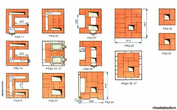 10 sıra. Baca oluşumu bununla başlar. Geriye doğru genişleyerek oluşur. Kırıntı fırınının tasarımını dikkate alarak, tüm fırının kaymış ağırlık merkezi nedeniyle bir tuğla üst borunun montajının imkansız olduğu unutulmamalıdır.